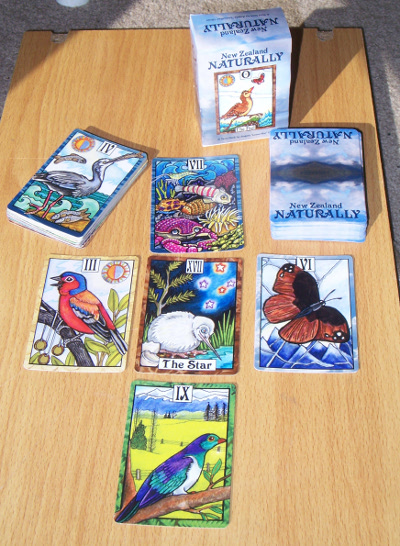 NZ Naturally Tarot An illustrated tarot deck themed around the natural world of New Zealand, a fascinating country. Based on the traditional Rider-Waite deck, the suits are now represented by different habitats, and the flora and fauna that calls it home. From the depths of the native forest, to the harsh reaches of the alpine range, across the golden shores and rolling waves to the urban environment of concrete and money, all can be found in this unique deck. Printed by The Game Crafter. |